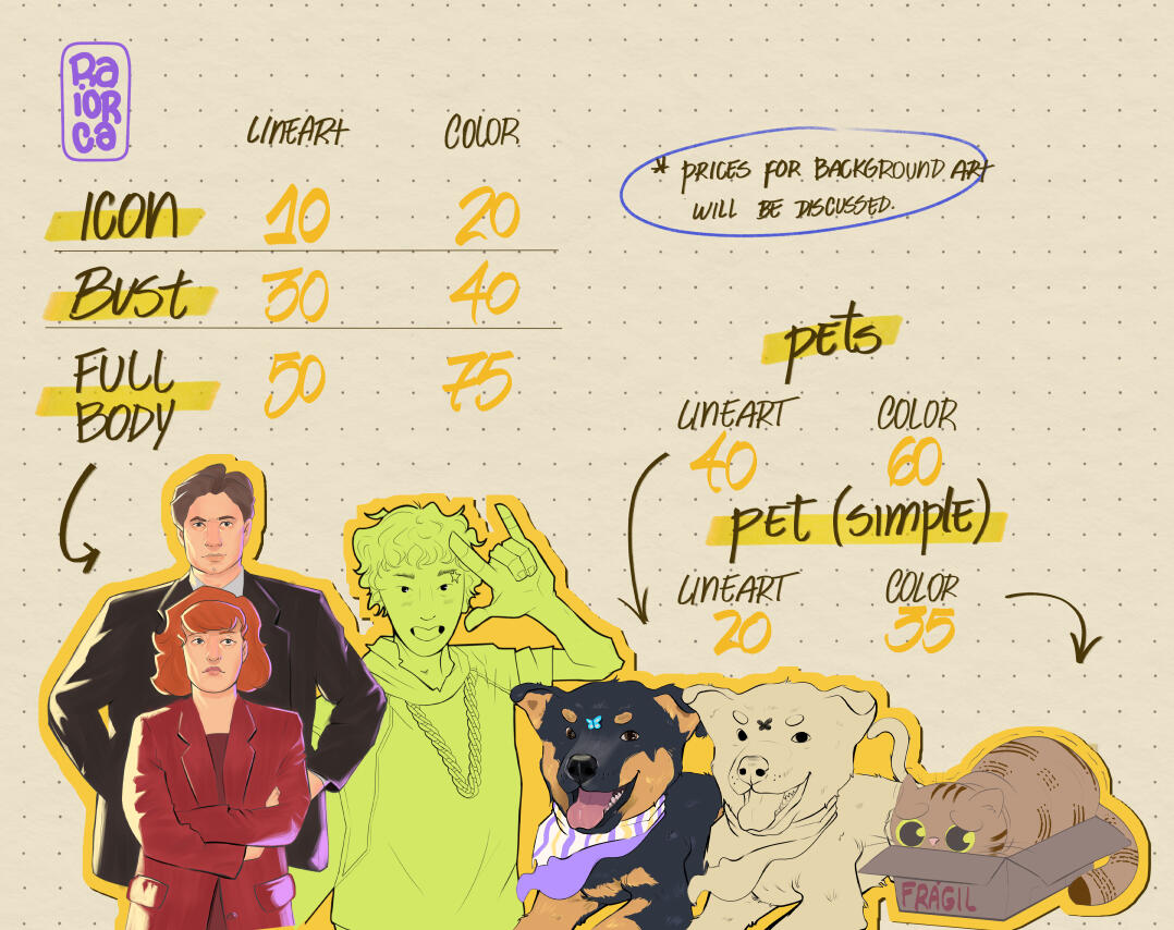 - Commissions must be paid 100% upfront, or 50% at the start and the remaining 50% after the base colors are approved.